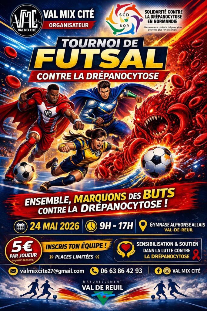 ⚽ Samedi 24 mai de 9h à 17h : Grand tournoi de futsal ouvert à tous ! Que vous veniez taper dans le ballon, regarder le documentaire, participer au débat ou simplement soutenir une bonne cause, votre présence est précieuse 💪❤️ La drépanocytose touche de nombreuses familles, souvent dans l’ombre.